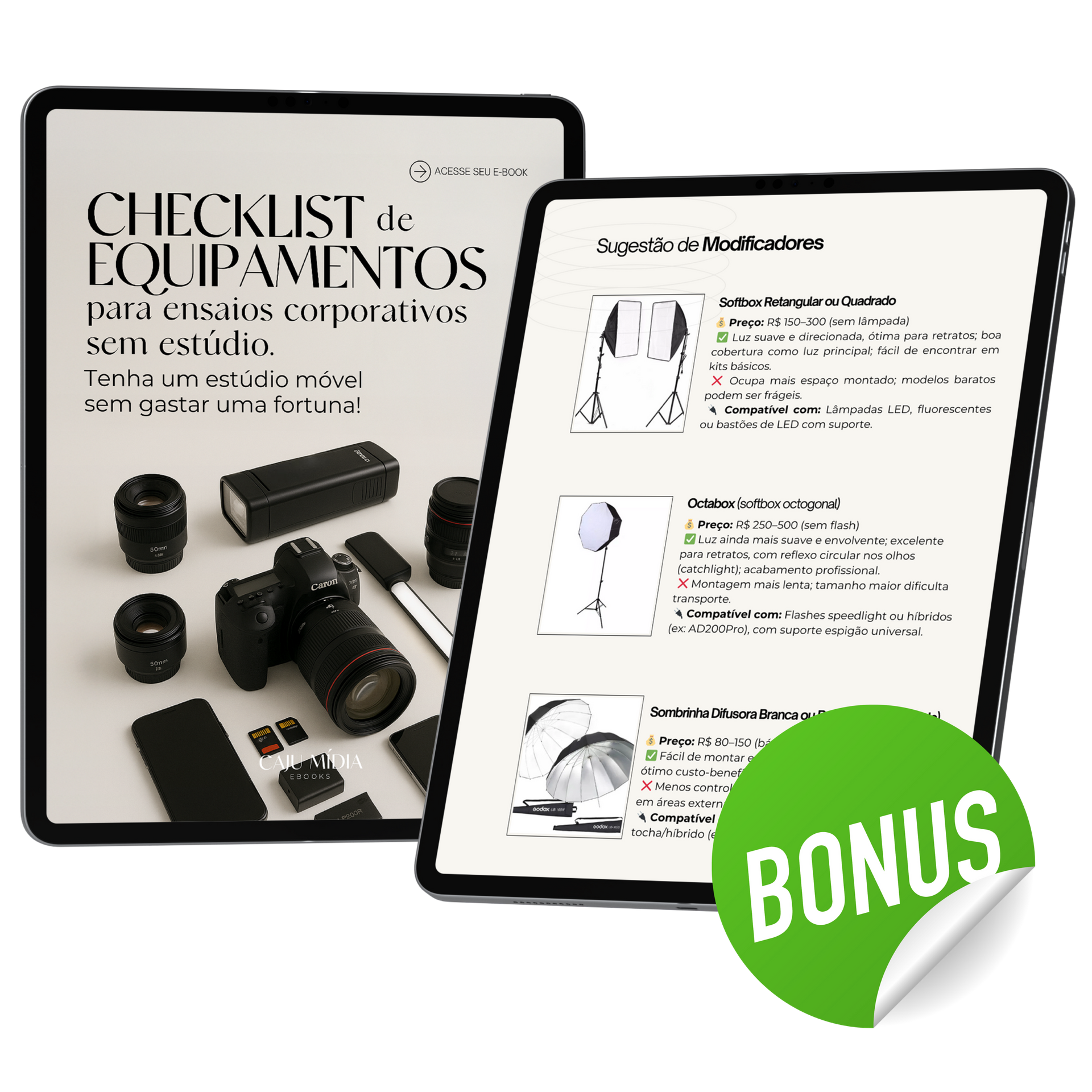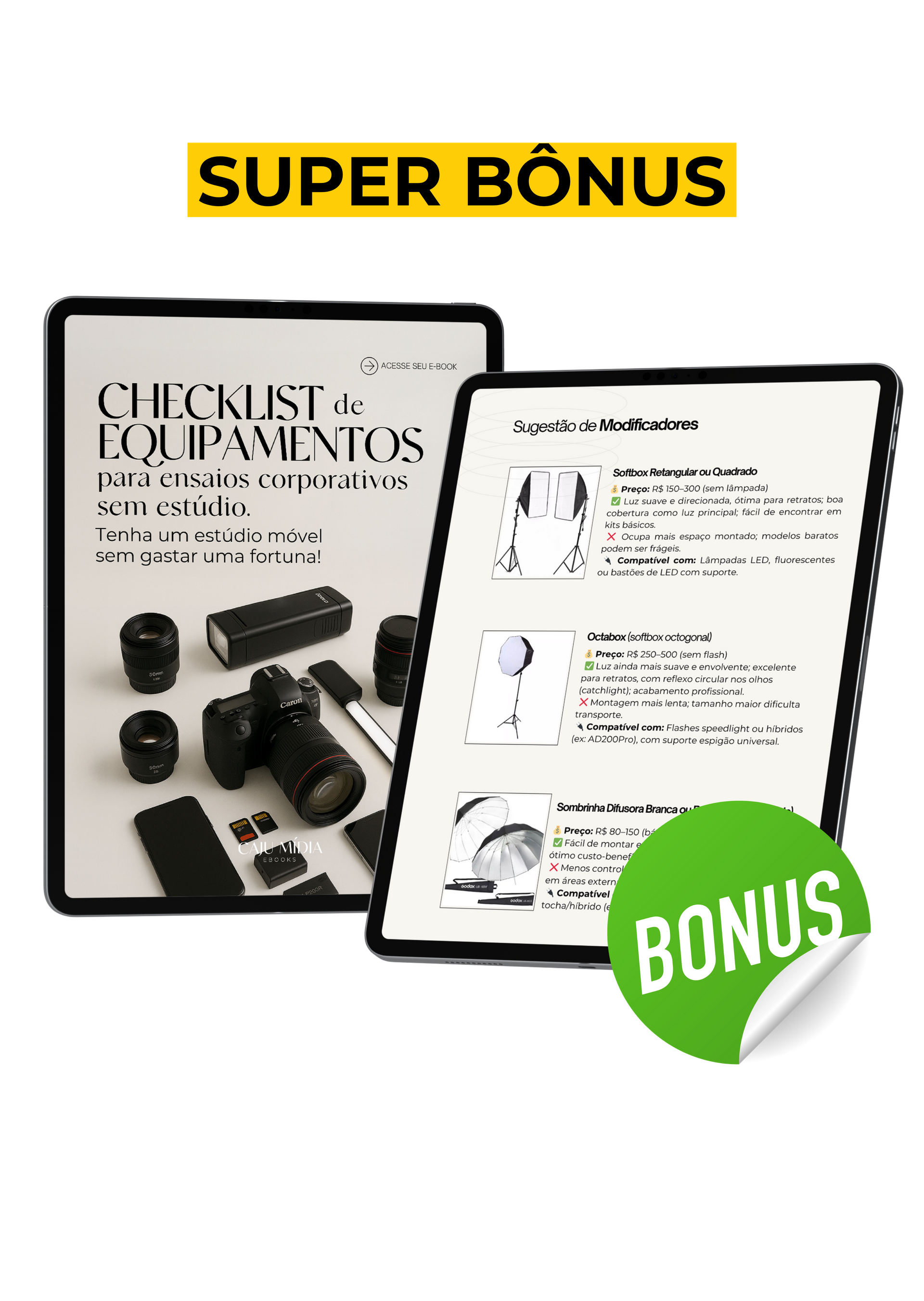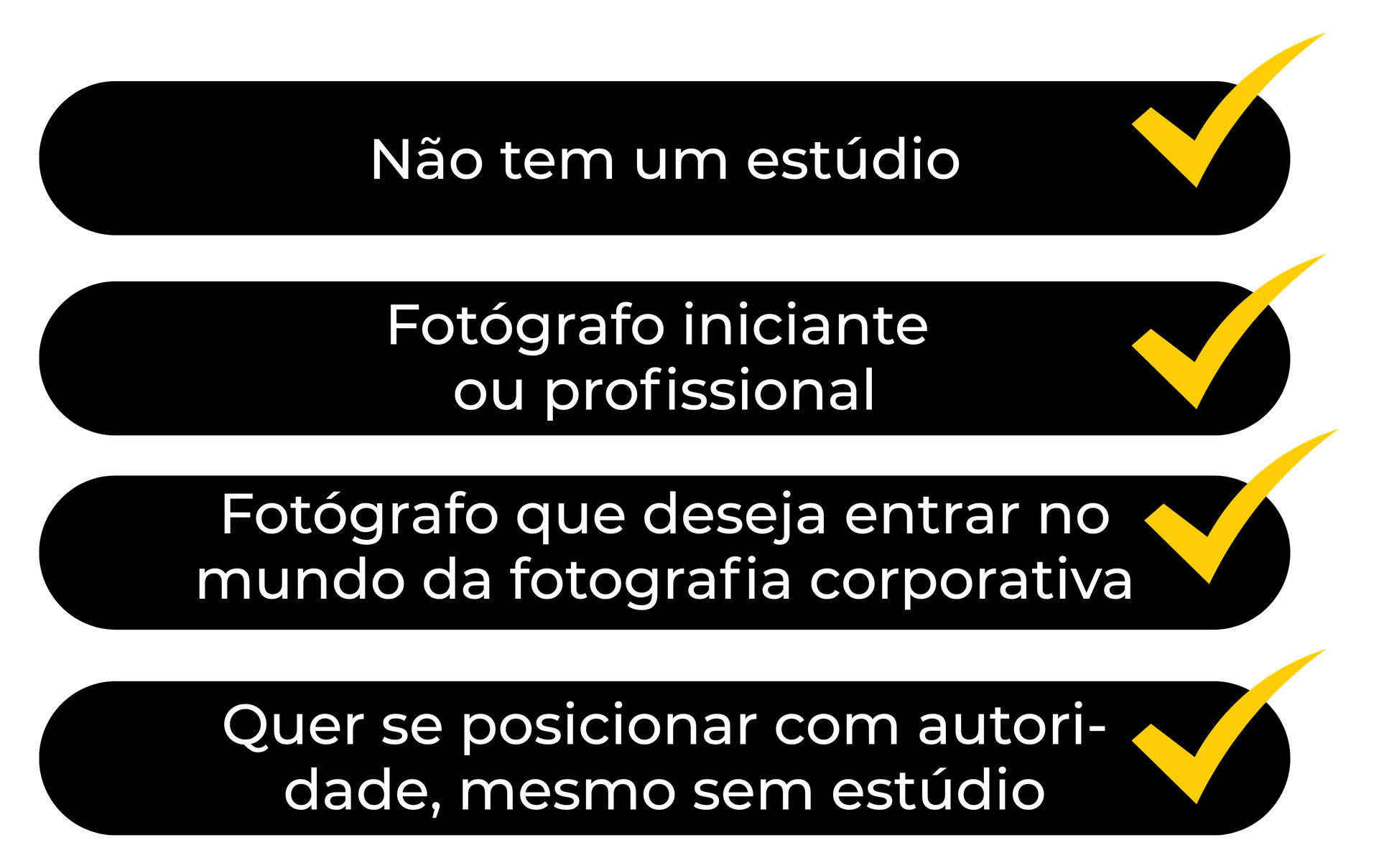 O foco principal é o universo corporativo, mas muitos ensinamentos podem ser aplicados em outras áreas como retratos profissionais, branding pessoal e fotos de equipe.
