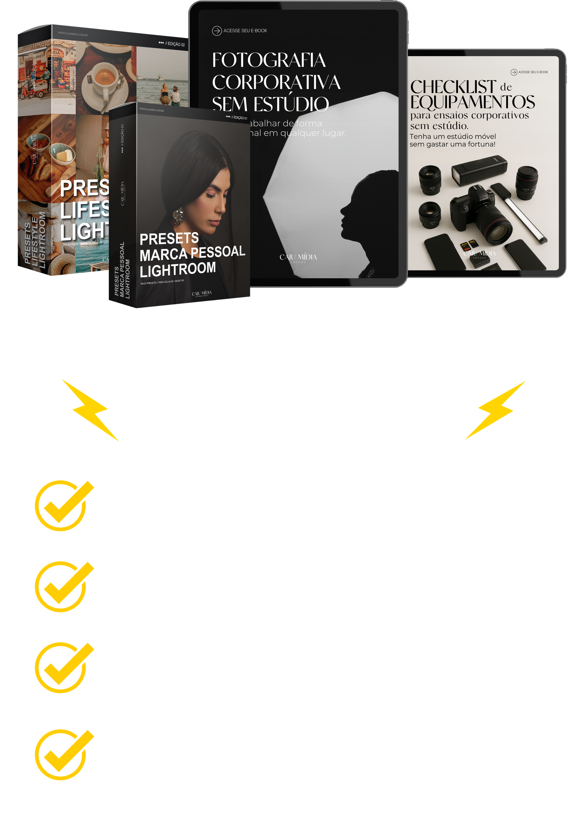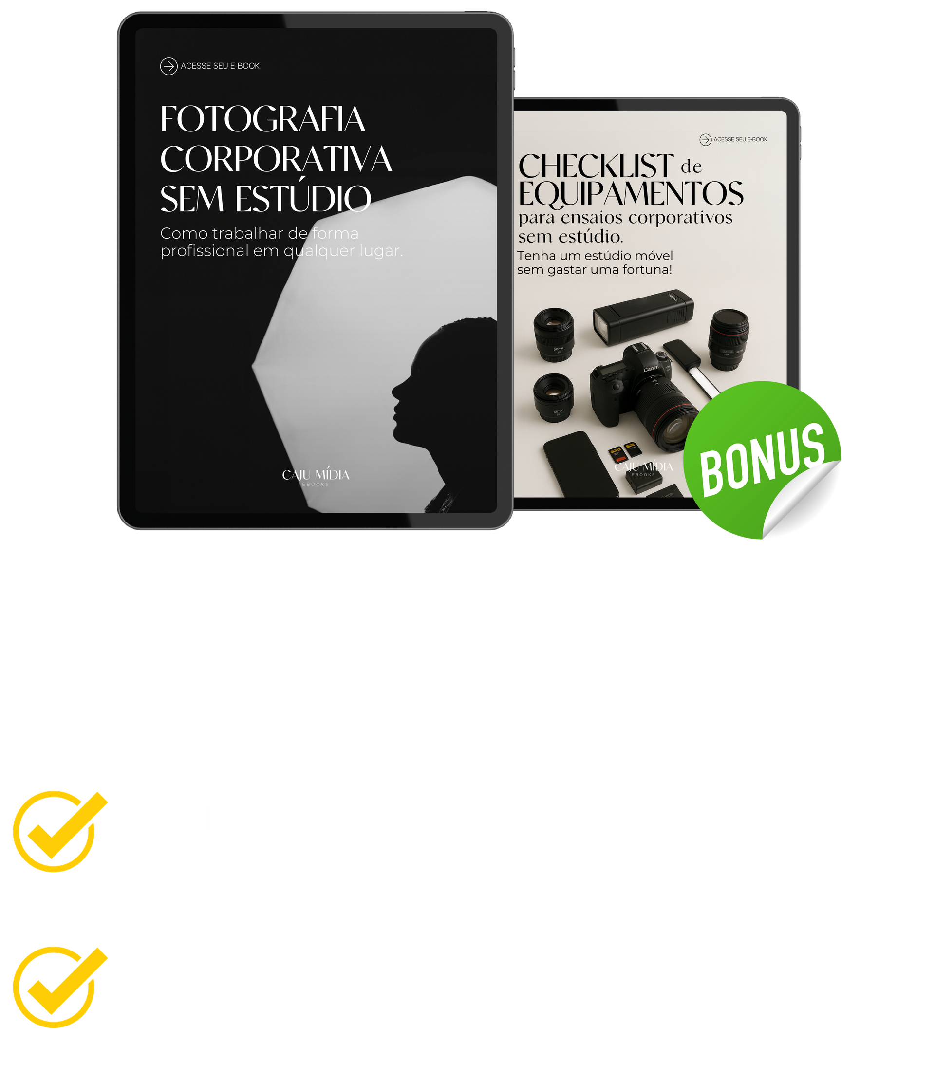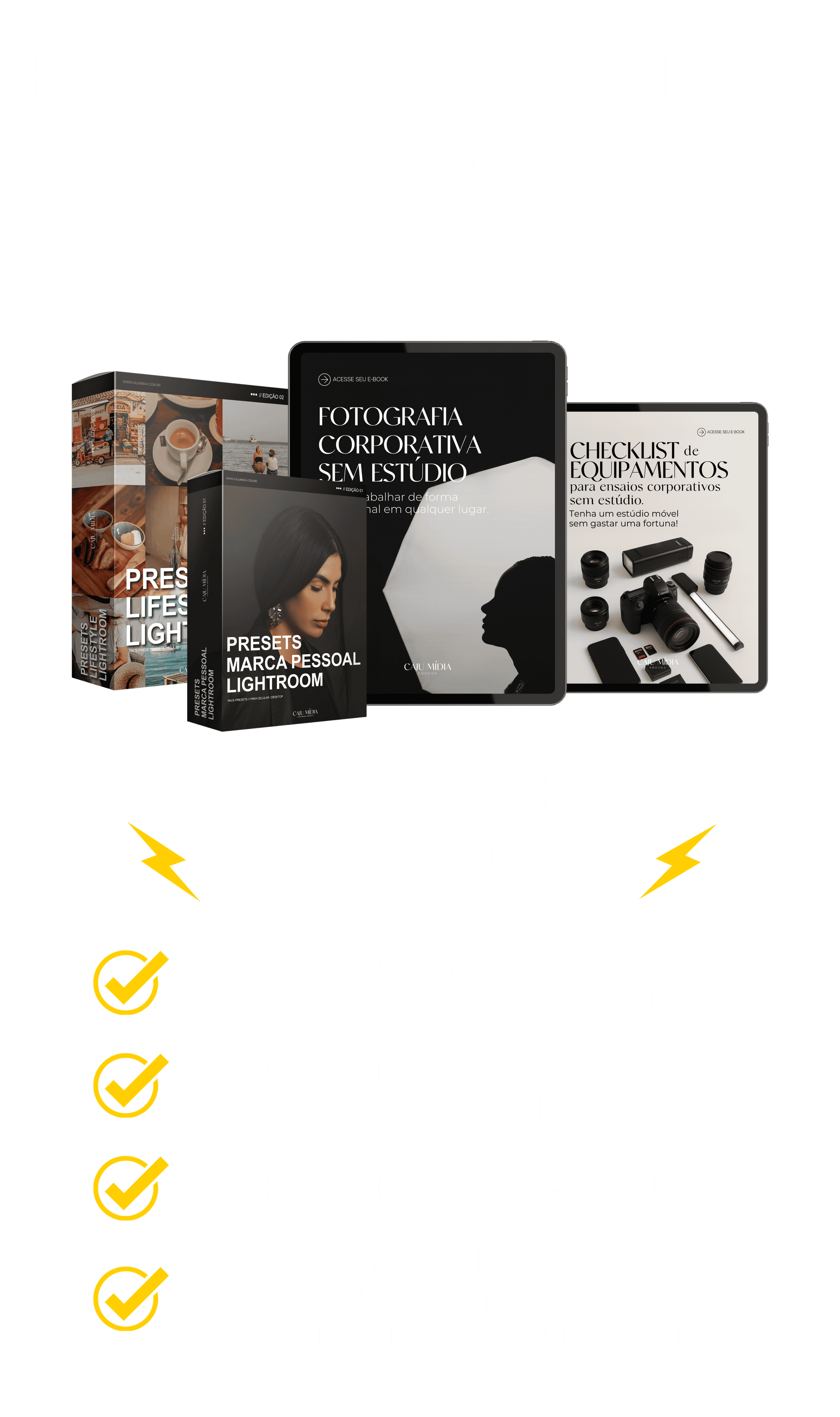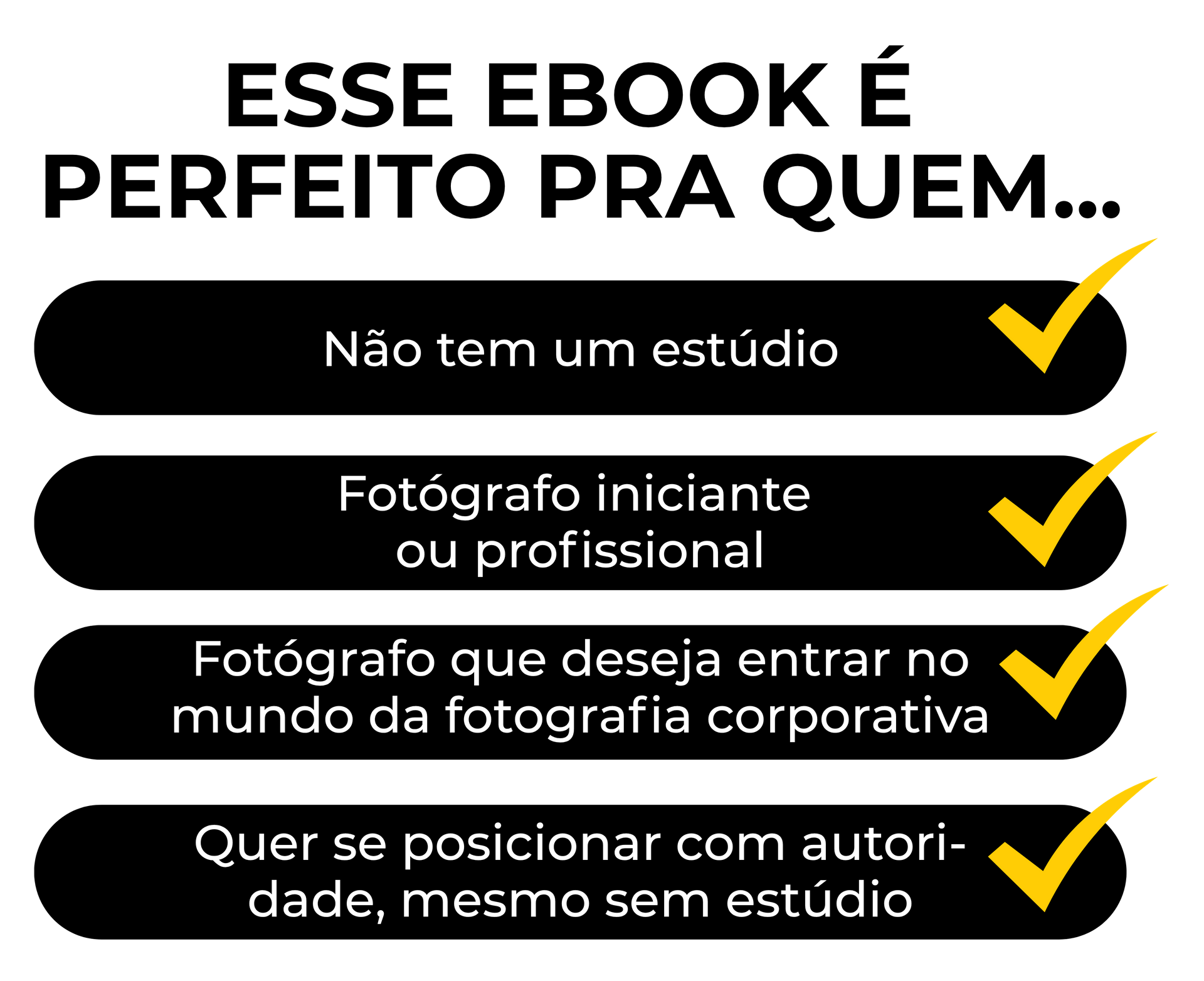 O foco principal é o universo corporativo, mas muitos ensinamentos podem ser aplicados em outras áreas como retratos profissionais, branding pessoal e fotos de equipe.